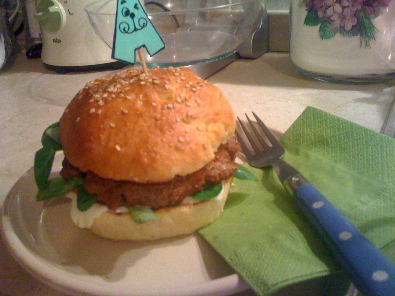 Il primo maggio è stata una giornata assai bruttina, è piovuto parecchio e non sembrava primavera! Io ho voluto creare l’ atmosfera del pranzo sul terrazzo in piedi, ho preparato una cena con hamburgers completamente home made! (che bugiarda che sono, le salse erano comprate ;-D )E’ stato un vero successo, ottimi! Li ha apprezzati anche mia mamma che di solito con il cibo fast food fa sempre la bocca storta…e poi che meraviglia quei bei panini morbidi!!!! Provateli, il gusto è assolutamente tutto un altro film…