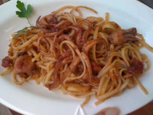 Aggiungere metà del prezzemolo tritato, i pomodori, una punta di peperoncino in polvere ed eventualmente poca acqua, coprire e cuocere a fiamma vivace una mezz’ ora abbondante. Quindi scoperchiare, aggiustare il sale; cuocere le linguine al dente e saltarle in padella con i moscardini aggiungendo poca acqua di cottura della pasta ed alla fine l’altra metà del prezzemolo ed un giro di olio – buon pranzo!!!